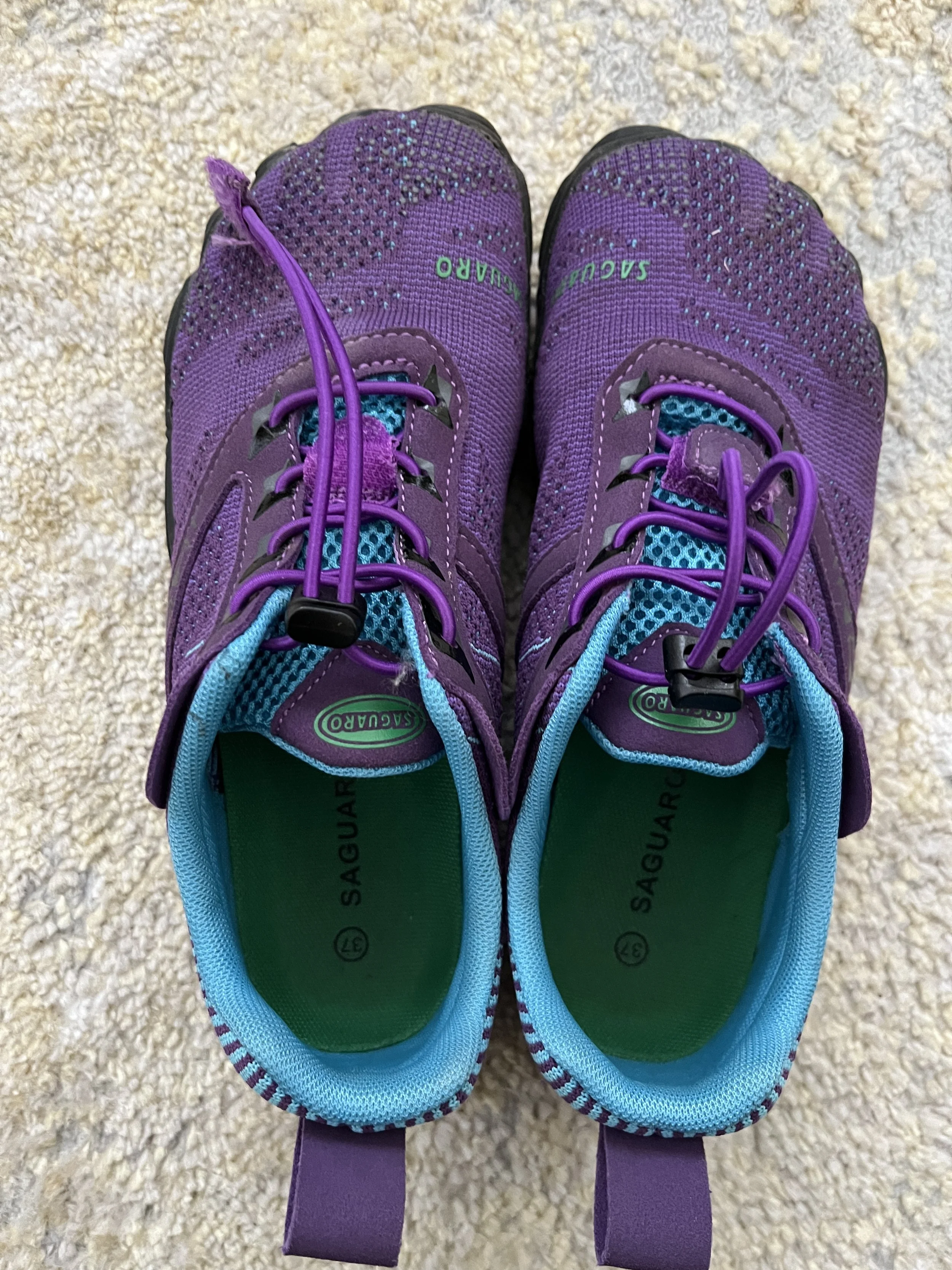 Impulsively, I dashed forward to grab the heavy bag, dressed in my travel “uniform” of stretchy black pants, hot pink and purple tops, backpack strapped across my shoulders, and my Saguaro barefoot shoes in all of their bright purple and blue splendor.